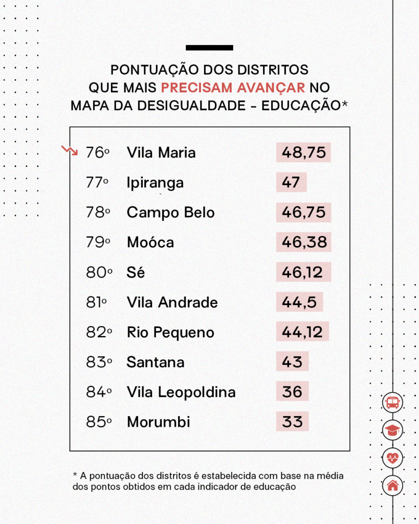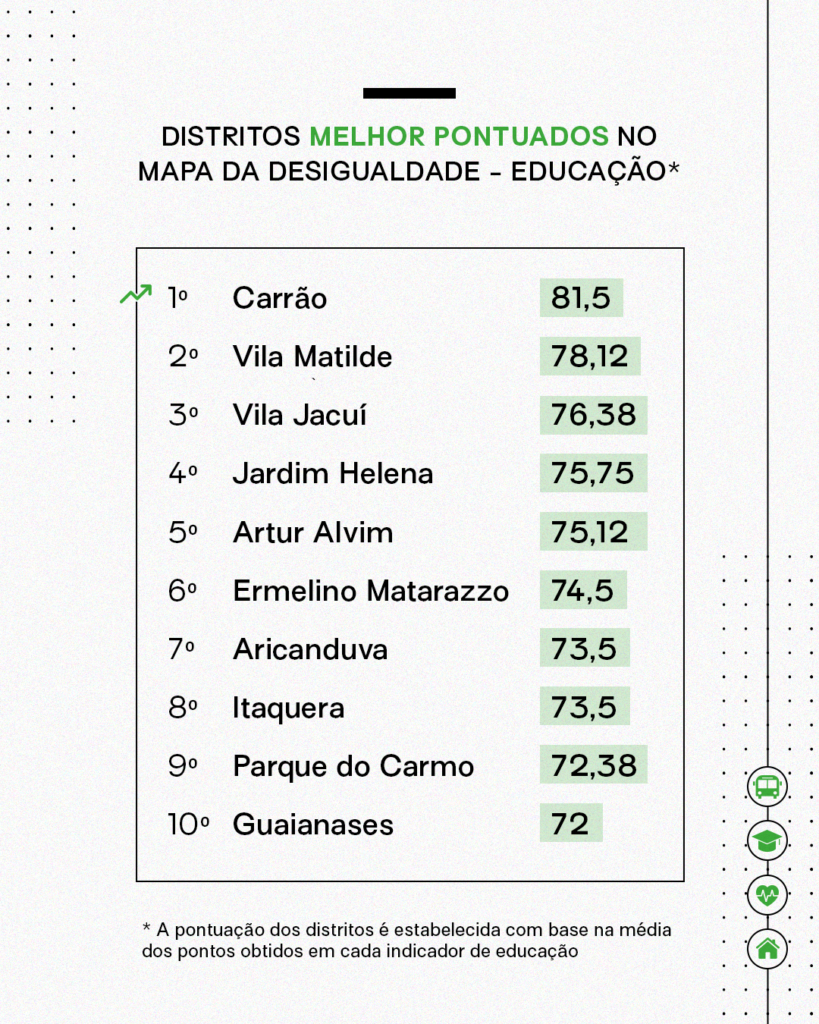 Com este conjunto de indicadores, a Rede Nossa São Paulo avaliou o desempenho geral dos distritos na área da educação por meio de um sistema de pontuação e ranqueamento de cada localidade, com base na sua posição em relação às demais.